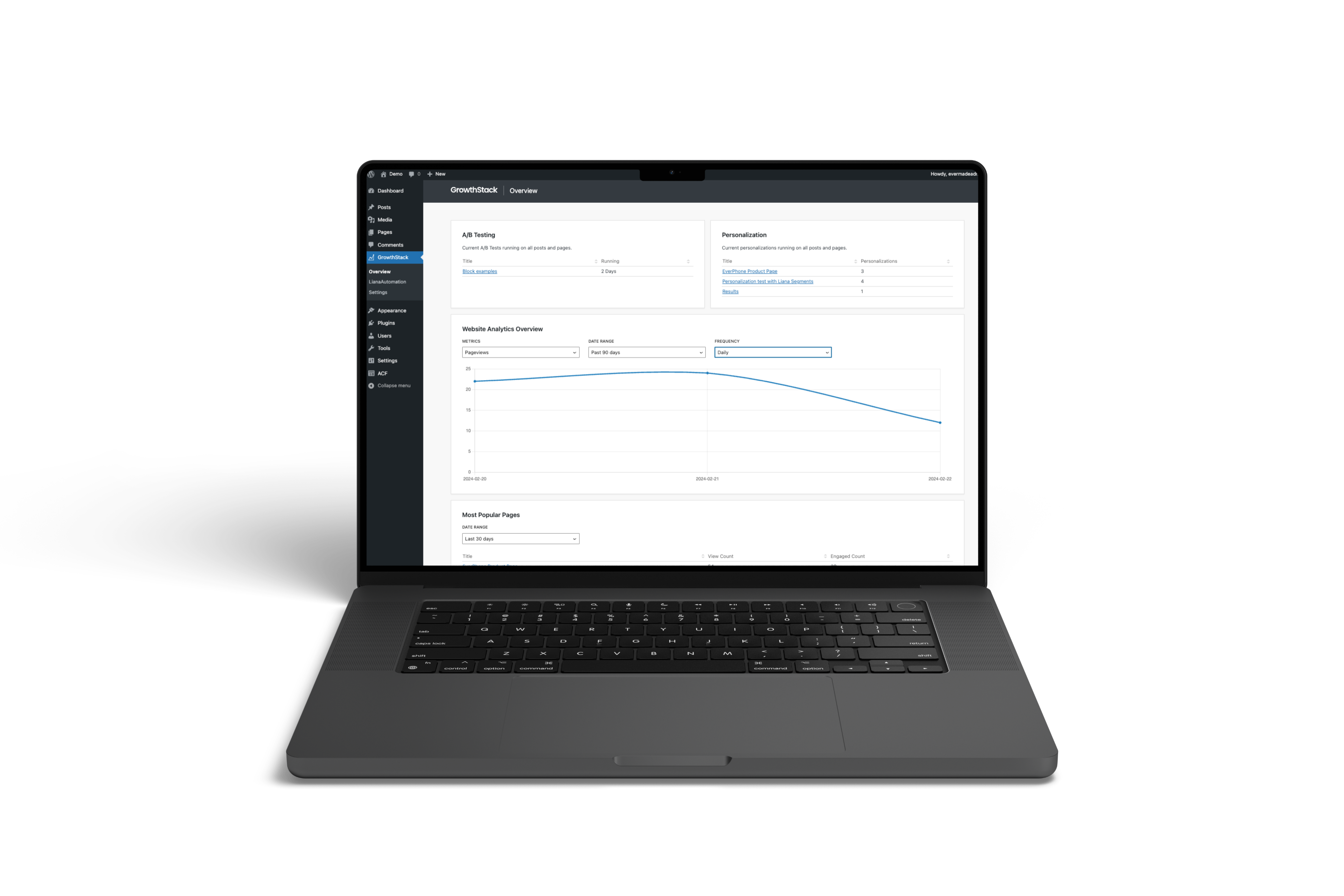 Täydennä WordPressin perustason analytiikkaominaisuuksia. GrowthStack tarjoaa yksityiskohtaista, sivukohtaista tietoa, jonka avulla parannat tuloksiasi.