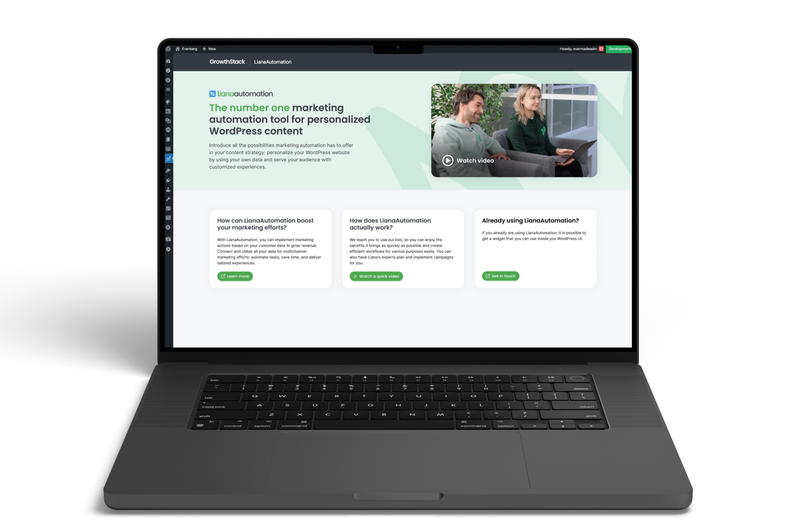 GrowthStack by Liana tarjoaa ainutlaatuisen tavan WordPress-sivuston sisältöjen personointiin. Hyödynnä markkinoinnin automaation mahdollisuuksia sivustollasi ja luo personoituja sisältönäkymiä asiakasdataasi perustuen. Käytä A/B-testausta löytääksesi toimivimmat sisällöt sekä seuraa ja optimoi sivustosi suoriutumista edistyneillä analytiikkaominaisuuksilla.